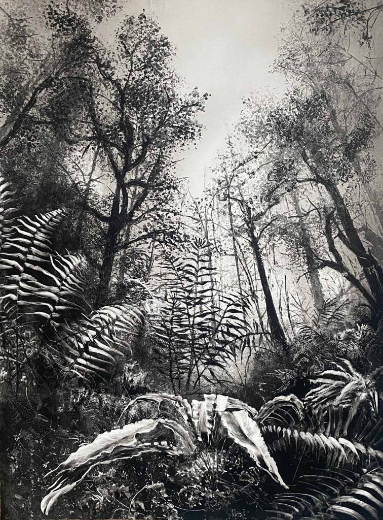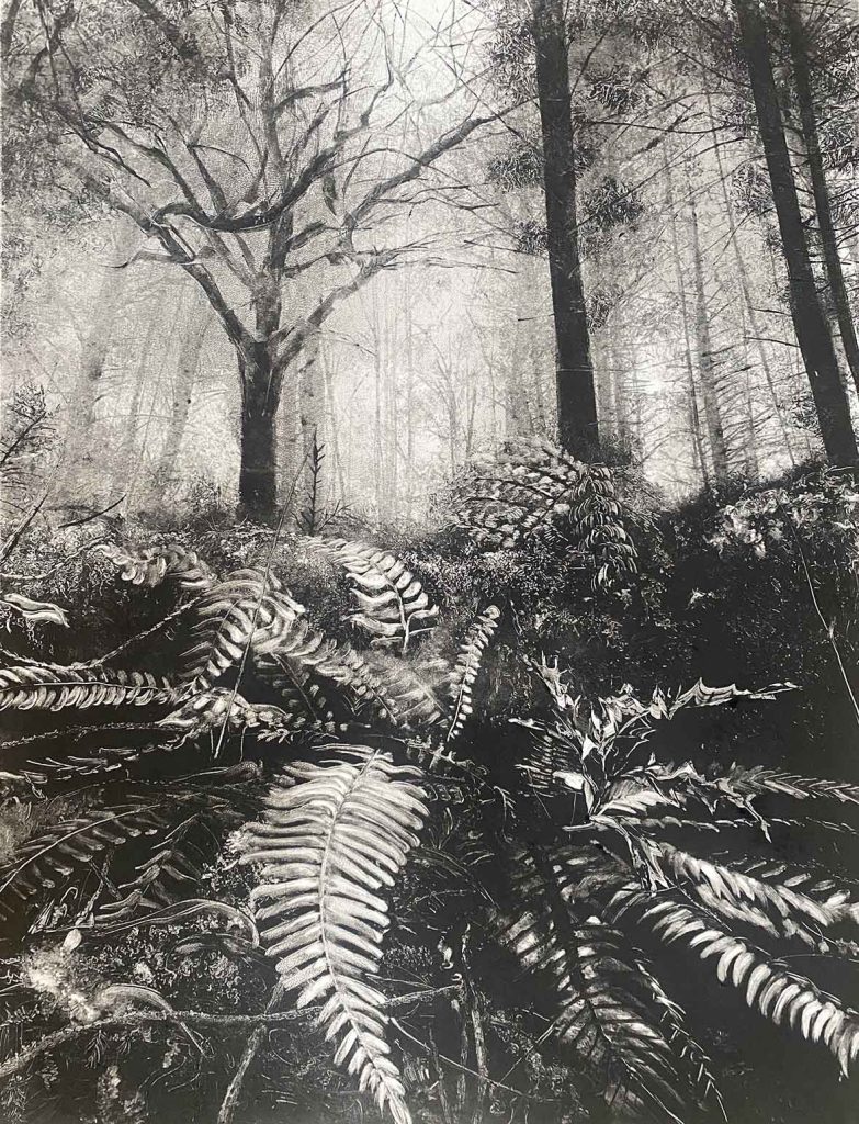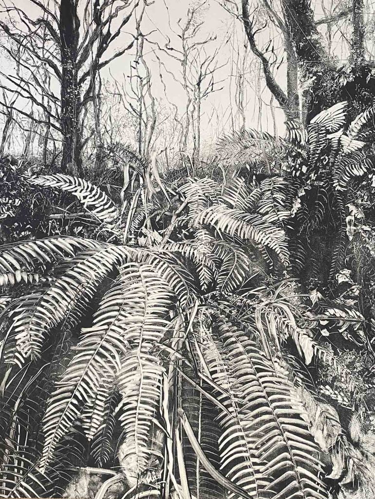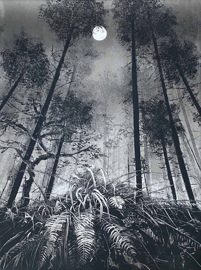 Fiona Fouhy is an artist who predominantly uses monotype techniques in her work; she also animates her prints and drawings, creates her own ink and uses experimental drawing and photography. Processes, materials and chance inform and evolve her practice. The scale of her work is guided by the subject matter – credit-card size images for tiny fairy-ink cap mushrooms or large-scale paper for expressive, windswept trees.